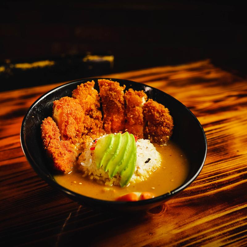 Crispy panko chicken with golden curry, potatoes, carrots & gohan. topped with pickled ginger, avocado, furikakе.